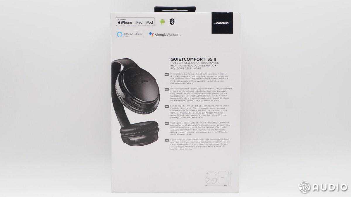 包装正面采用黑白配色,下方有BOSE的标志,产品名称:QUIETCOMFORT35Ⅱ,具备NOISECANCELLING(降噪)特性。
