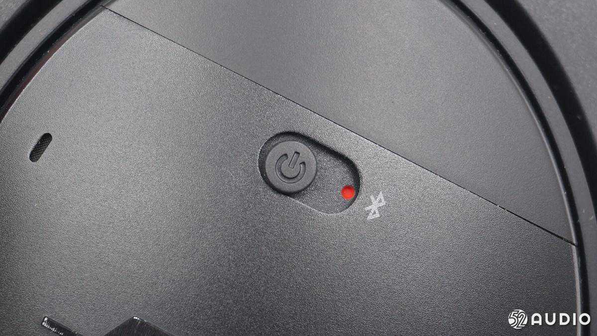 电源/蓝牙开关按钮钮帽特写,用红绿色点标记出耳机开关状态。