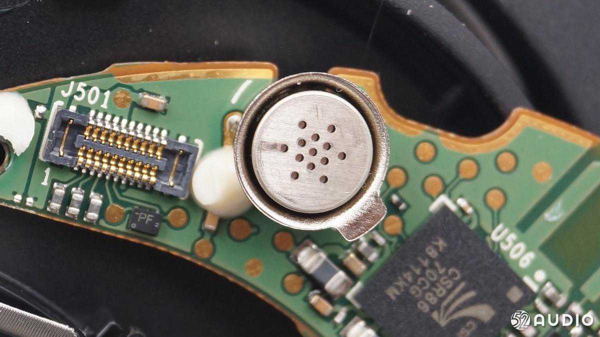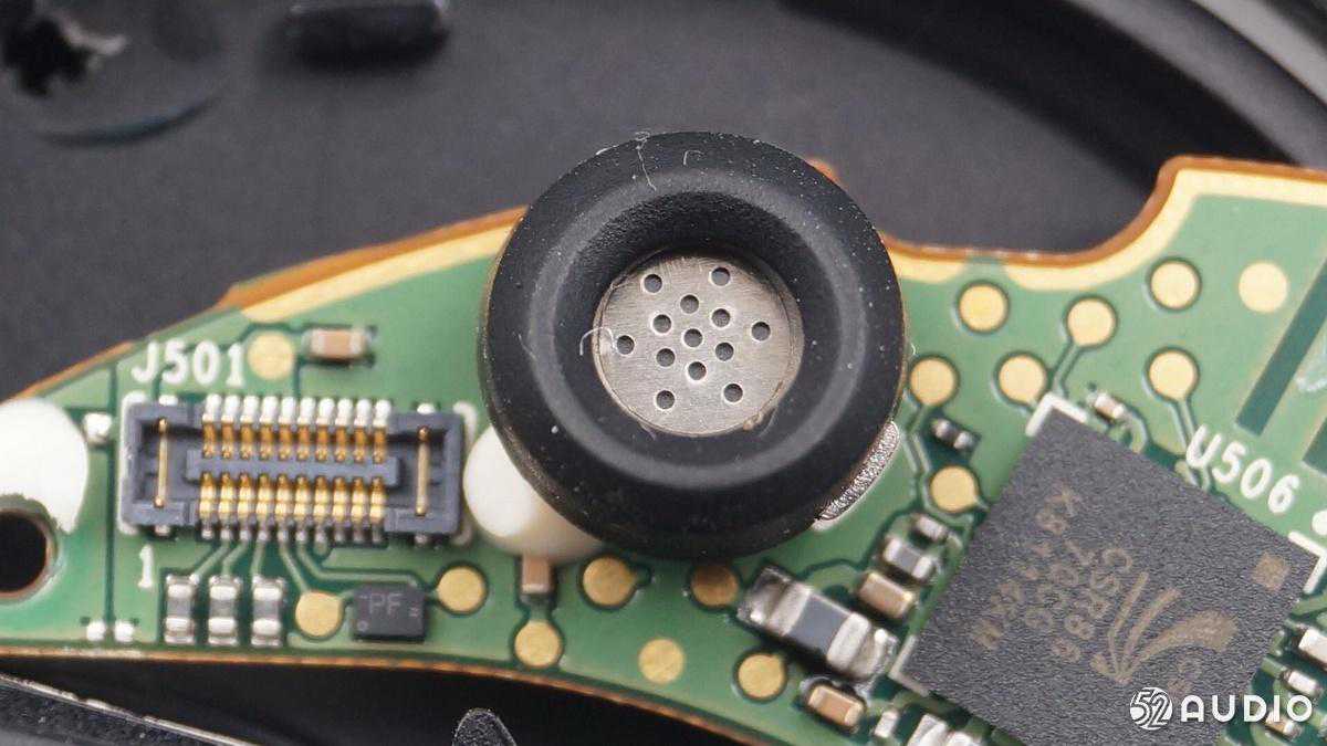 耳机单元振膜上面是一块硬质金属网,起到支撑和反射声音的作用给降噪麦克风。