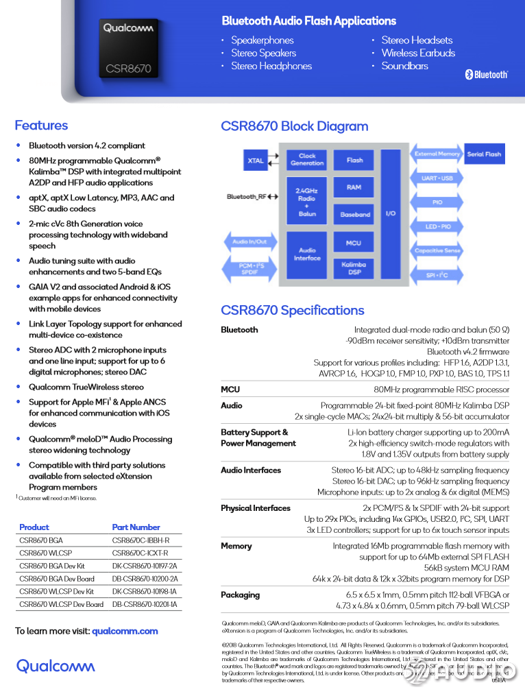 QualcommCSR8670详细资料,从PDF上可见支持支持aptXHiFi音频。