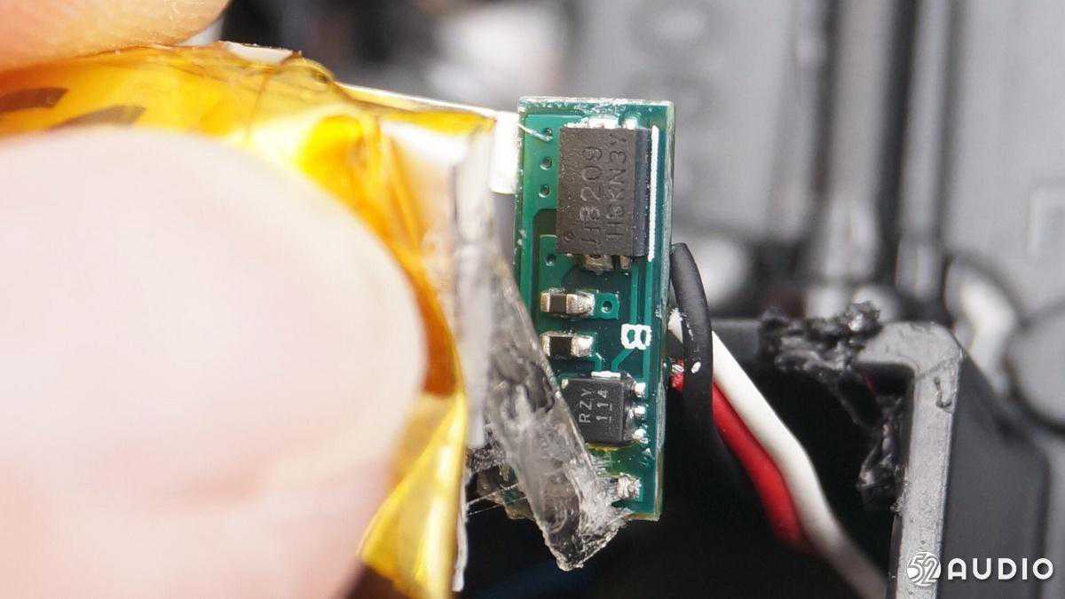 这块电路板上焊接着电池和音频输入以及连接到另外一只耳机的连线。
