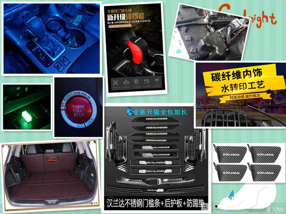 上某淘,不看不知道,一看吓一跳,无数的汉兰达装饰品只怕想不到不怕买不到,于是“中毒”了,一不小心花费大了。以下是不完全统计,给汉兰达车友一个参考: