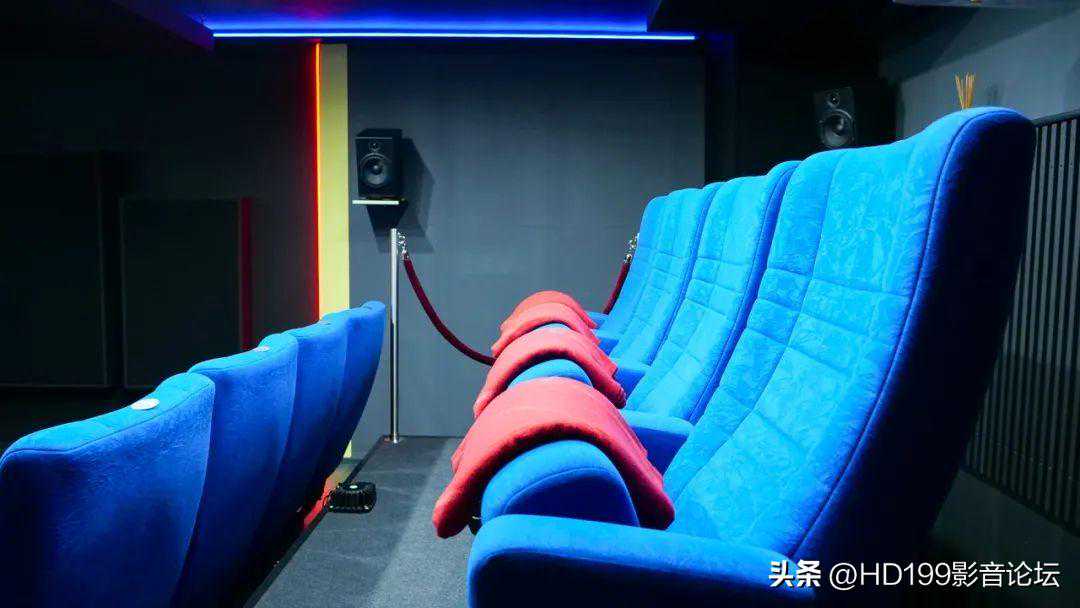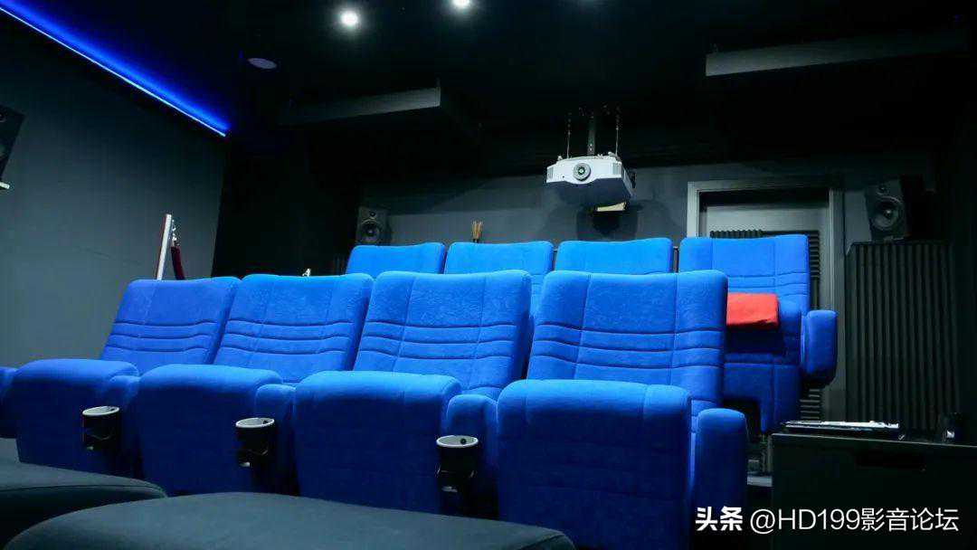 影院安装了非常醒目的蓝色座椅,配备了杯架和座椅号,像电影院的座椅一样,是可以自动翻起来的。