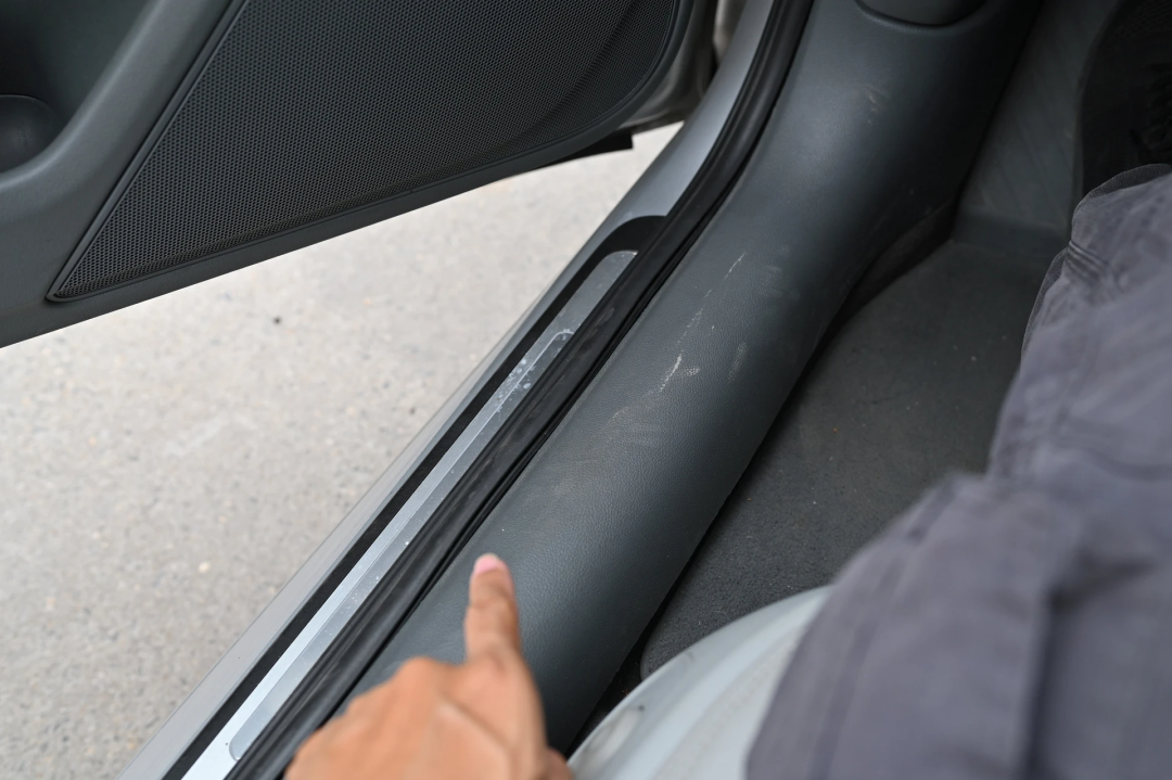 我还发现个问题,就是这个门槛饰板没装到位,估计是鉴定师看车后的疏忽,我试了试,超级紧,没搞动,周一回公司安排钣金师傅搞定。