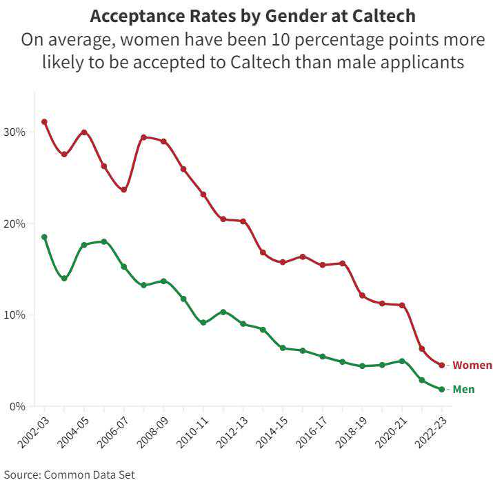 《华盛顿邮报》在2014年的一项分析表明,四所以科学和工程见长的院校——麻省理工学院、加州理工学院(CaliforniaInstituteofTechnology)、卡内基梅隆大学(CarnegieMellon)和哈维穆德学院(HarveyMudd),校园中的男性占比显著高于女姓。也正是在这些院校,女性录取率大幅高于男性。在加州理工学院,自2003-04学年以来,男女申请者的录取率平均相差10个百分点。2022-23学年的女生录取率是男生两倍以上。