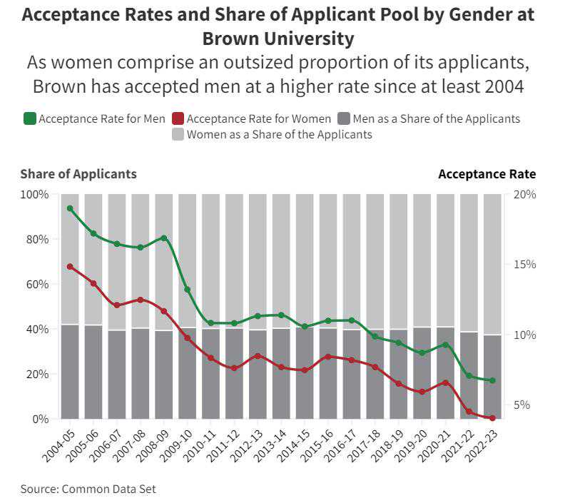 以人文学科见长的布朗大学(Brown)则与上述学校大相径庭,形成了有趣的对比:2022-23学年,布朗大学的女性申请人数为31710人(62%),男性申请者人数为18939人(37%),前者几乎是后者的两倍。而录取新生中男女人数大致相当:女生1287人,男生1275人——这意味着录取率的性别失衡:女性录取率4%,男性录取率6.7%。不论是申请者的性别比例,还是录取率性别失衡的偏向,布朗大学与麻省理工学院似乎处于两个相反的极端。