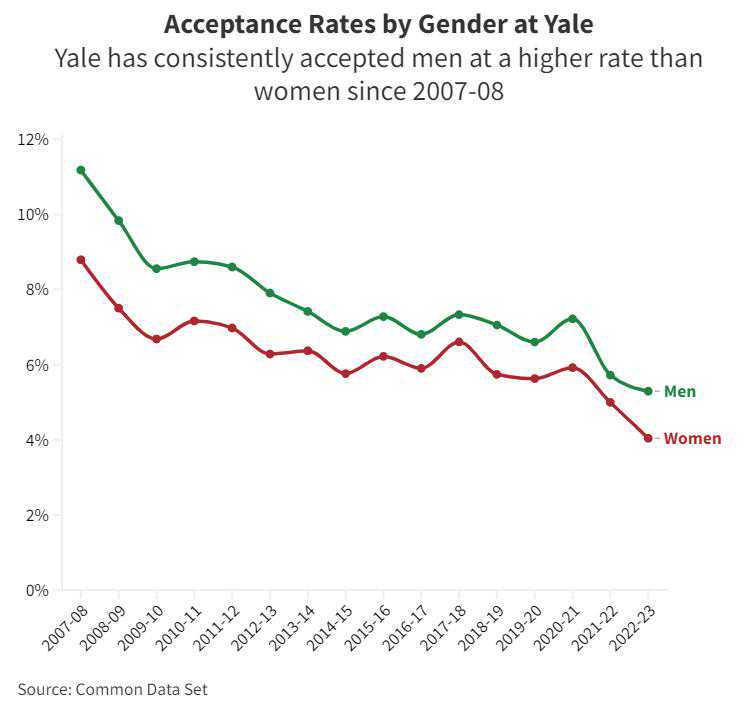 耶鲁大学(Yale)同样存在类似偏向,自2008-09学年以来,耶鲁大学的男生录取率始终高于女生。2022-23学年,女性和男性在申请者中分别占比58%和42%,这一差距在新生中收窄,分别占比51%和49%。