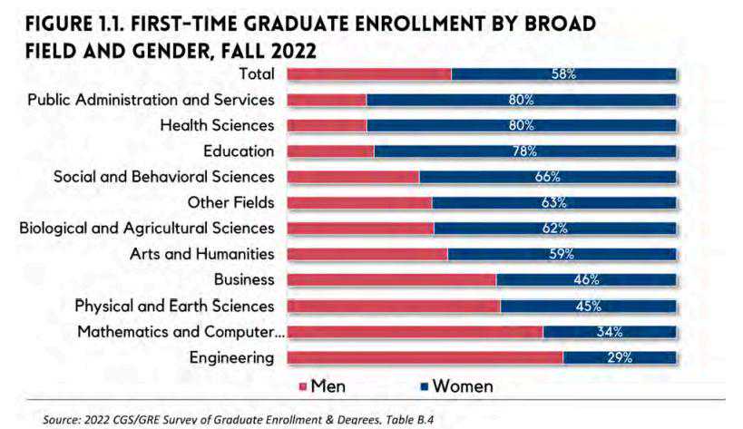 仍以2022年秋季入学的研究生为例,虽然女性总体占比达58%,但在不同专业领域的比例分布十分不均,各专业性别偏向明显。女性在公共行政服务(79.6%)、健康科学(79.5%)领域占据绝对优势,却在工程(29.0%)、数学与计算机(34.2%)、物理与地球科学(45.2%)等领域举步维艰。此外,全体新生中男性的全日制就读比例(74.3%)也高于女性(68.7%)。