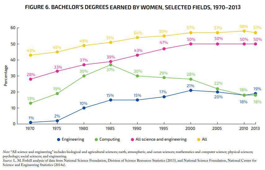 纵向统计或许能说明更多问题。以历年学士学位获得者为例,自1970年起,女性在科学工程领域的总体占比逐年上升,并从1985年开始超过男性。但在工程与计算机学科,呈现出的走向与之大不相同:从1970年到2000年,工程学士的女性占比从1%逐年递增至21%,随后却陷入停滞和下滑,到2013年,女性占比已缓降至19%。