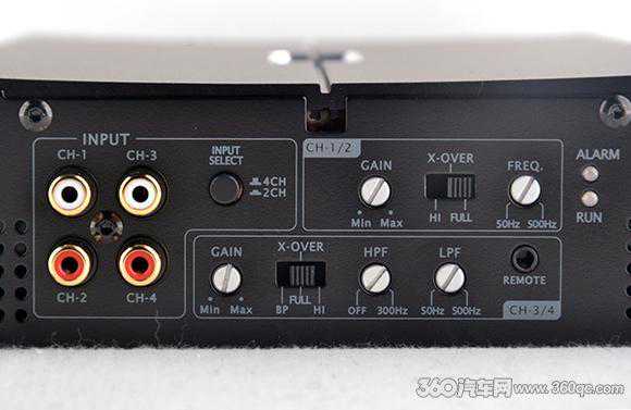 从输入端看,我们会发现对比老款优化精简了不少。左侧是四声道的RCA输入端子,以及四/二声道输入转换按钮,按下功放只进行二声道输入,不按下就是一台四路,原来在下方的输入电平按钮取消。功放设计为纯以RCA低电平输入信号,所以老款上的REM和Audio等自动信号开关也被取消。右侧的1、2声道调节上,可以选择全通或者高通,频响范围在50Hz-500Hz可调以及GAIN增益可调。下侧的3、4声道调节上,可选高通、全通和带通,高通全通频响为0Hz-300Hz,带通则在50Hz-500Hz之间可调,同样提供GAIN增益可调,此外还预留了超低音线控插口。