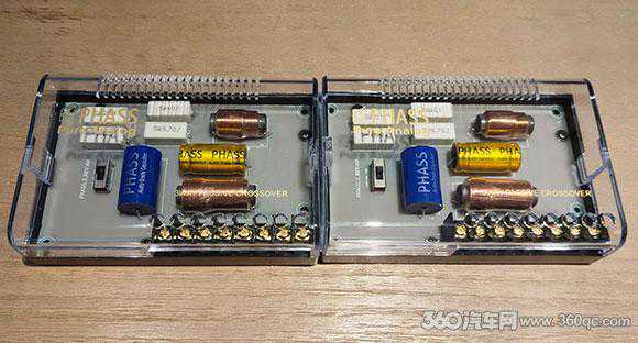 分频器布局简洁直接,可以看出为了更好的音频信号梳理,妃仕用上自己定制的聚酯电容和电解电容、铁芯电感,左上部是水泥电阻。各个元器件保持一定的间隙减少相互干扰,信号传输稳定真实,各频段声音精准调校还原极佳音色。