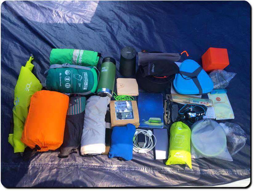 迪卡侬睡袋、TAREvolite气垫、TAR坐垫、换洗衣裤、皮肤衣、KK保温杯、Bose小水桶、LightMyFire餐具、充电宝、咖啡、钱包、Kindle、挪客小水桶、营地水桶灯、火枫炉头锅具、头灯等各种小物件。