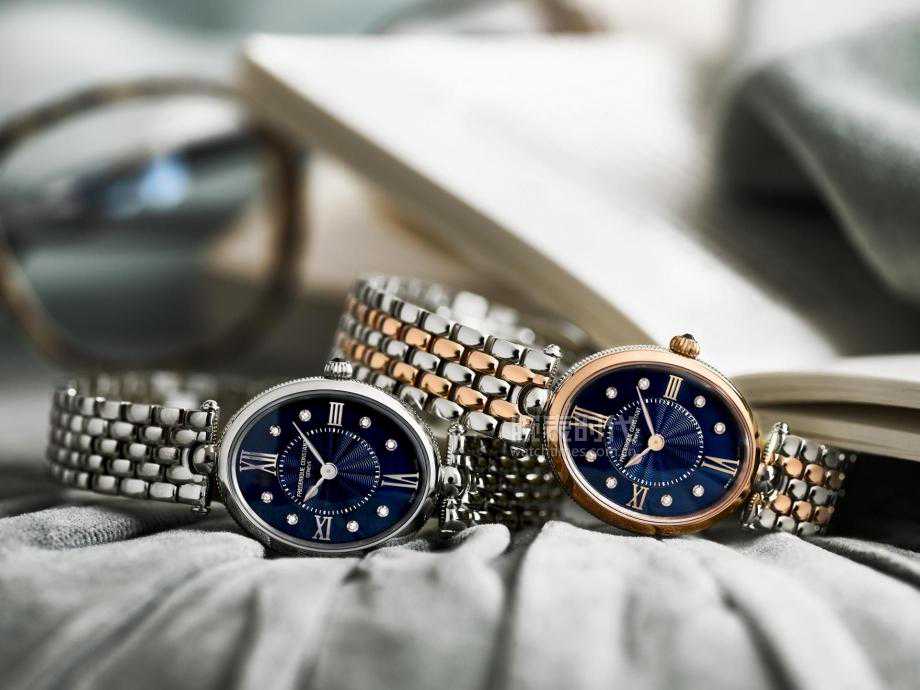 女表也非常青睐蓝色,2019Pre-Basel,康斯登ArtDéco系列华丽回归,系列以1920年代的奢华宴会为灵感,以隽永美感优雅点缀现代女士腕间。新系列的所有腕表均搭载FC-200石英机芯。机芯配备7枚宝石轴承,电池续航时间超过5年(63个月),精准可靠。此外,经过悉心抛光的椭圆形表壳,适合佩戴于纤细腕间。蓝色表盘中央饰有玑镂扭索纹(Guilloché),精致又古典。钢款售价1150欧元,折合人民币约8700元;镀金间金款售价1350欧元,折合人民币约一万。
