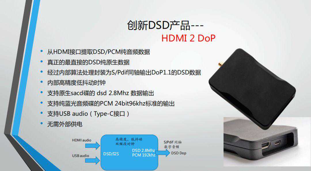 发布会的最后,介绍了即将上市的DSD新品:HDMI2DoP转换器,具备HDMI和USB输入及同轴输出,方便玩蓝光机播放SACD的玩家连接转盘输出DSD信号给传统解码器的连接,是一款史无前例且性价比极高的产品。