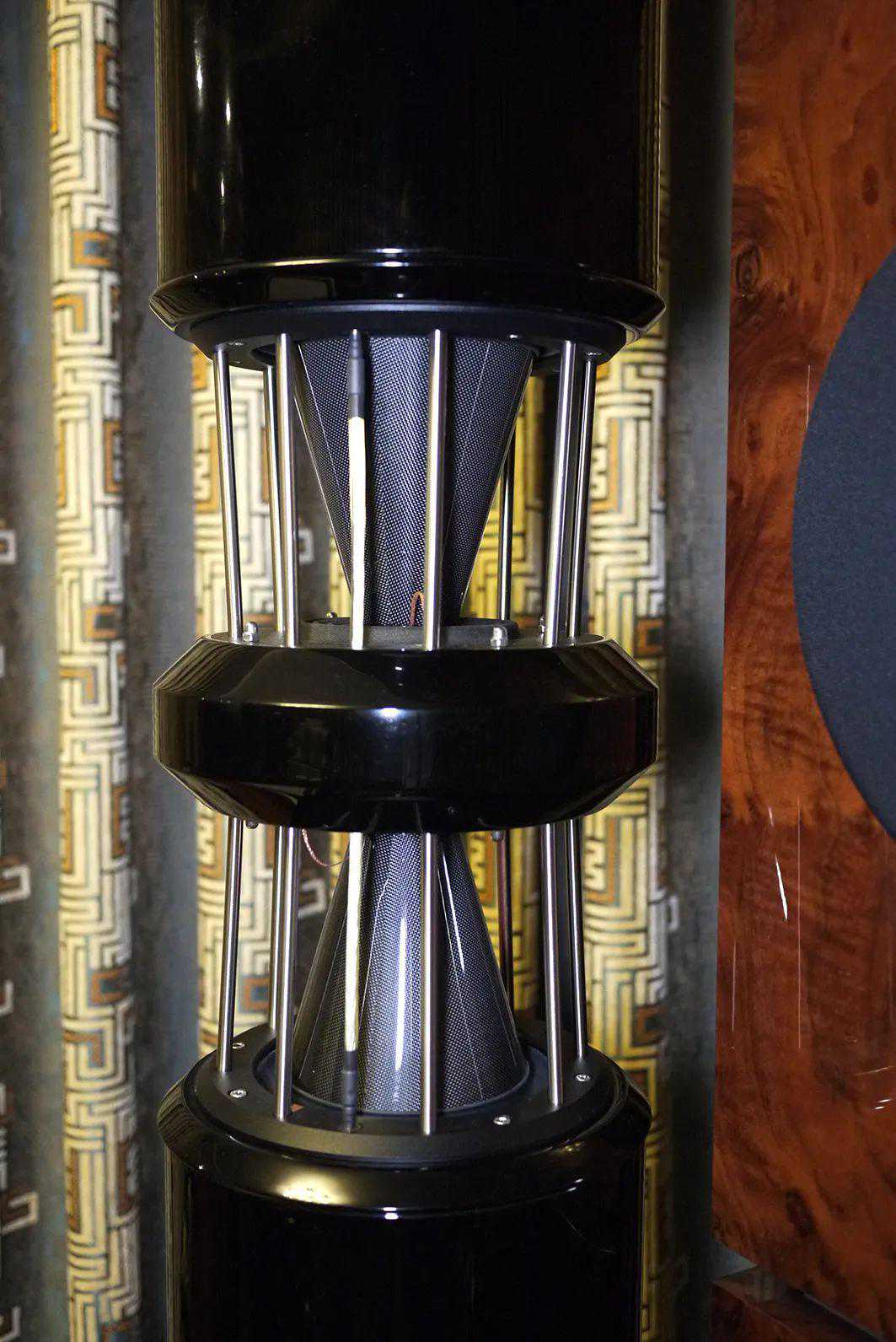DDD单元振膜部分比一般的锥形中音或低音单元锥体更长,口径相当于常见的锥盆中音单元大小,但振膜的展开面积大概相当于10英寸锥盘单元。DDD单元通过音圈的上下运动挤压锥体振动而形成全向扩散发声,可以知道这种设计相比传统的锥盘单元可在聆听空间产生更多的反射声,营造出更为庞大的空间感。而且DDD单元是全频响应的,发出的频率涵盖了超高的24kHz到中低频215Hz。DDD单元的振膜有碳纤维和钛合金两种材质版本可选,数据规格上的区别,在于高频上限的不同。碳纤维版本的振膜厚度为0.25mm,高频达24kHz,铝膜版本为21.5kHz。当然,不同材质振膜音色也会有些区别。PQS-402每个声道音箱采用两只DDD单元作垂直叠罗汉排列,从而在确保声波作360度最佳水平扩散的同时,也形成更宽广的垂直扩散角度,因此可适应更大范围的聆听位置高度,不会像那些分频音箱那样,仅在很窄的聆听高度才可感受最佳的平衡度和最低失真度。超低频则交由两只10英寸的超低压单元负责。另外,还采用了四只8英寸无源辐射器,令低频更具弹性,能量更充沛。从215Hz,低频能下潜至25Hz。