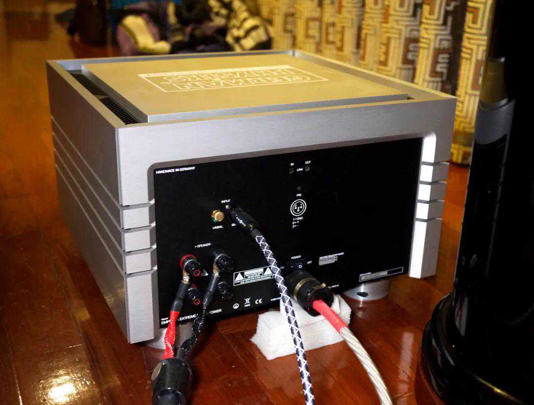 上次到访何府,搭配PQS-402的功放是GermanPhysiks德国殿堂原厂的EmperorPreamplifier帝王旗舰前级和两台EmperorExtremeMonoAmplifier旗舰单声道后级功放,每个声道用一台功放驱动,已经属于顶级的豪华配置。技术规格上PQS-402的灵敏度88.4dB属于中等,阻抗却仅为极为罕见的2.2欧姆,再加上这类大型落地箱普遍采用远场摆位聆听方式,因此理论上对功放的功率有非常高的要求。搭配的ExtremeMono单声道后级在8欧姆负载下输出功率高达800瓦,阻抗减半到4欧姆功率更是倍增到1600瓦,甚至在负载仅有2欧姆的时候仍然能够再倍增到3200瓦,可见其强调的电源供应能力与出色的功放线路设计,在Hi-的世界里属于巨无霸级别的存在。