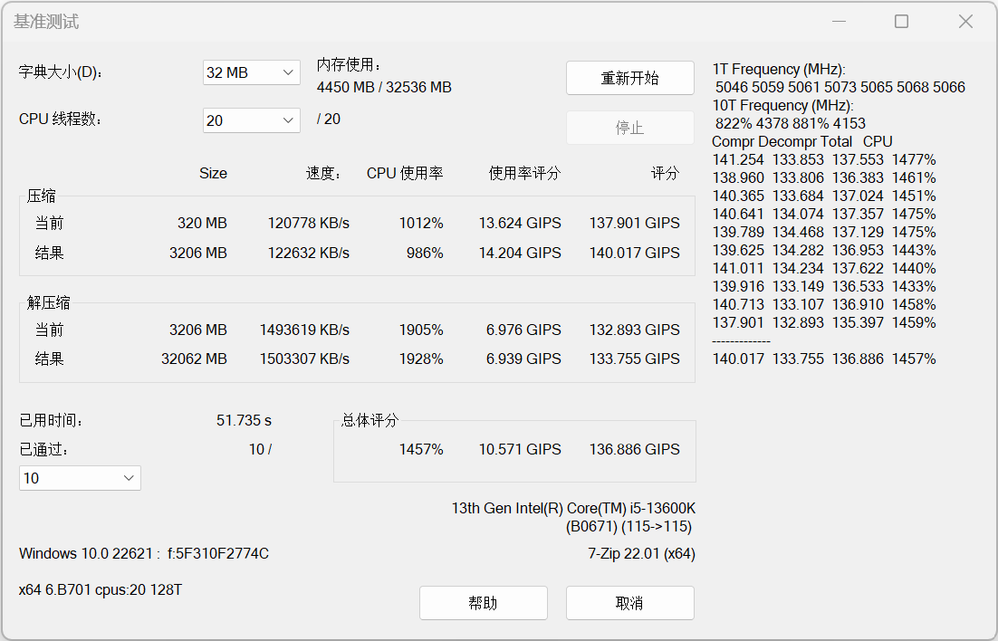 7-ZIP基准测试,DDR56600C34-40-40-105XMP配置
