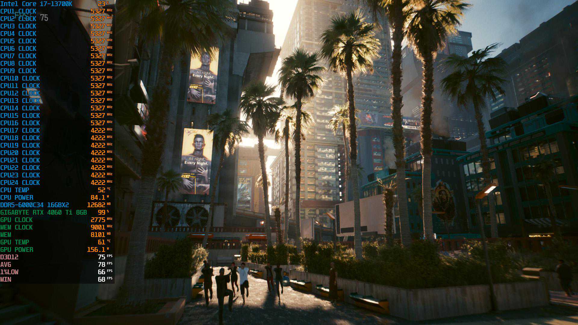 《赛博朋克2077》2K分辨率预设光线追踪:超级画质+DLSS3质量(帧生成),平均帧率达到78fps,曾经最吃硬件的光追3A大作,DLSS3一开,即便是中端的RTX4060Ti也能把它征服。