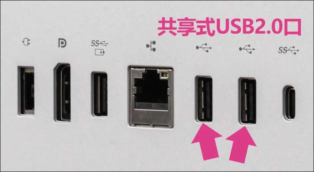 ●要强调的是,在“一线连”这个大功能上,YOGA27(2022)有相当多的易用性细节,比如机身背板上靠右的两个口是共享式的。你可以插接键盘鼠标,也可插接无线键鼠的USBKey,亦或是U盘。在一体机模式时,这些外设就为一体机所用;而在“一线连”模式,YOGA27变为笔记本或其他数码设备的“外接显示器”后,这些外设就为笔记本或其他数码设备所用——相当人性化,且等于扩展了接驳设备的接口数量。