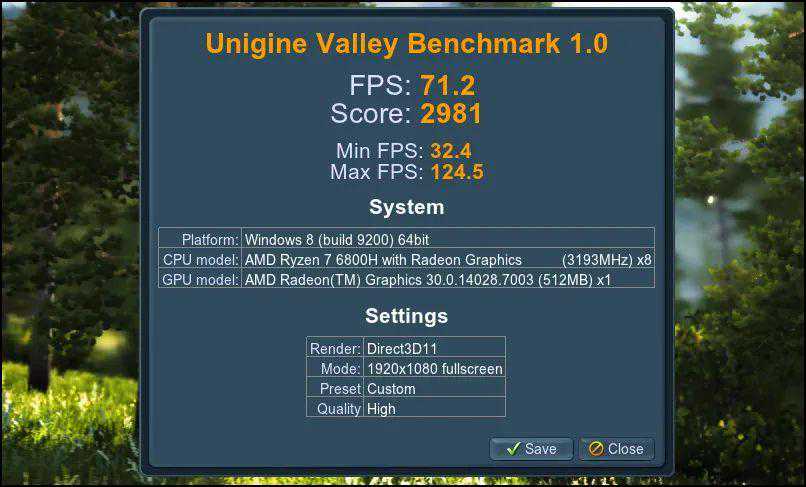 ▲R76800H真正的价值是其强悍的Radeon680M集显,性能相对于上一代RadeonGraphics集显提升了120%以上(3DMark得分,RadeonGraphics只有1100分左右,Radeon680M高达2450分),在集显中鹤立鸡群。而游戏3D性能甚至大幅超越了MX450(UnigineValley测试,上一代RadeonGraphics仅能跑31fps;英特尔IrisXe在43fps~55fps;MX450为62fps,而Radeon680M轻松跑到了71fps)。