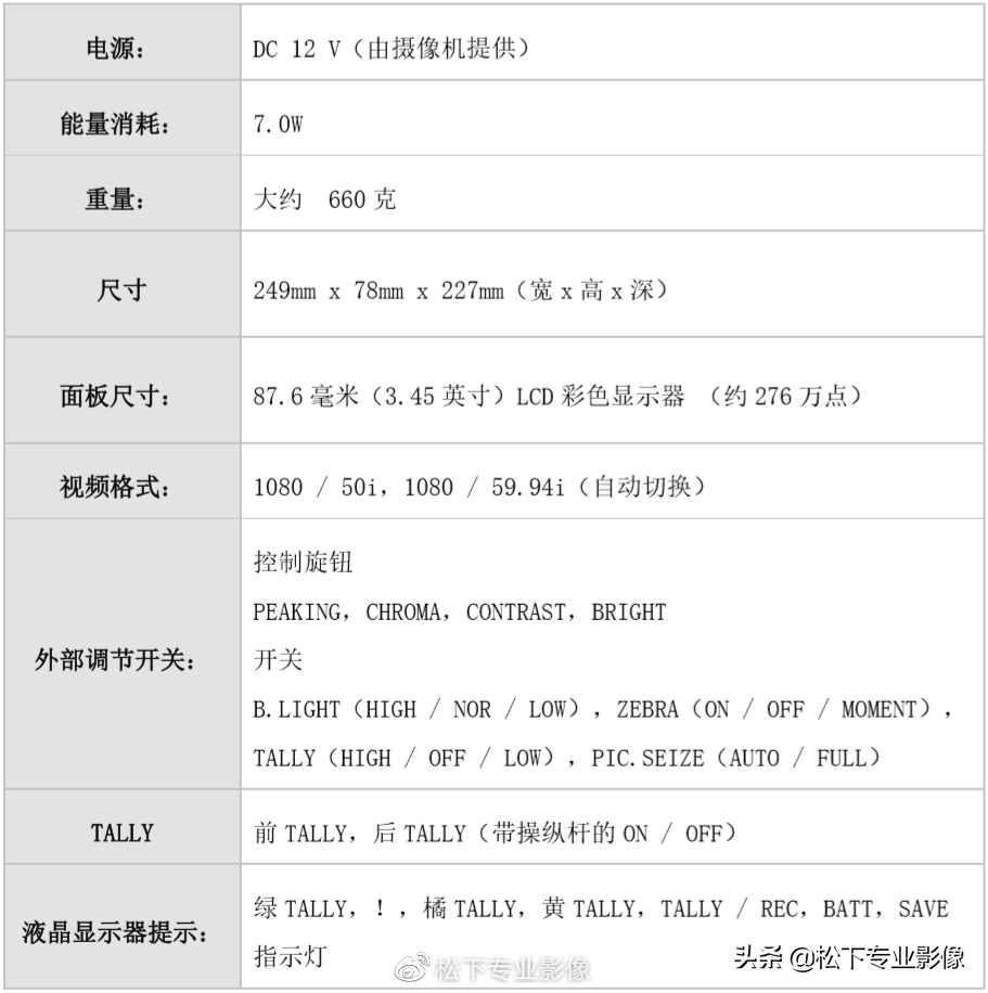■显示面板屏幕(OSD)具有黄TALLY,可与演播室摄像机配合使用。