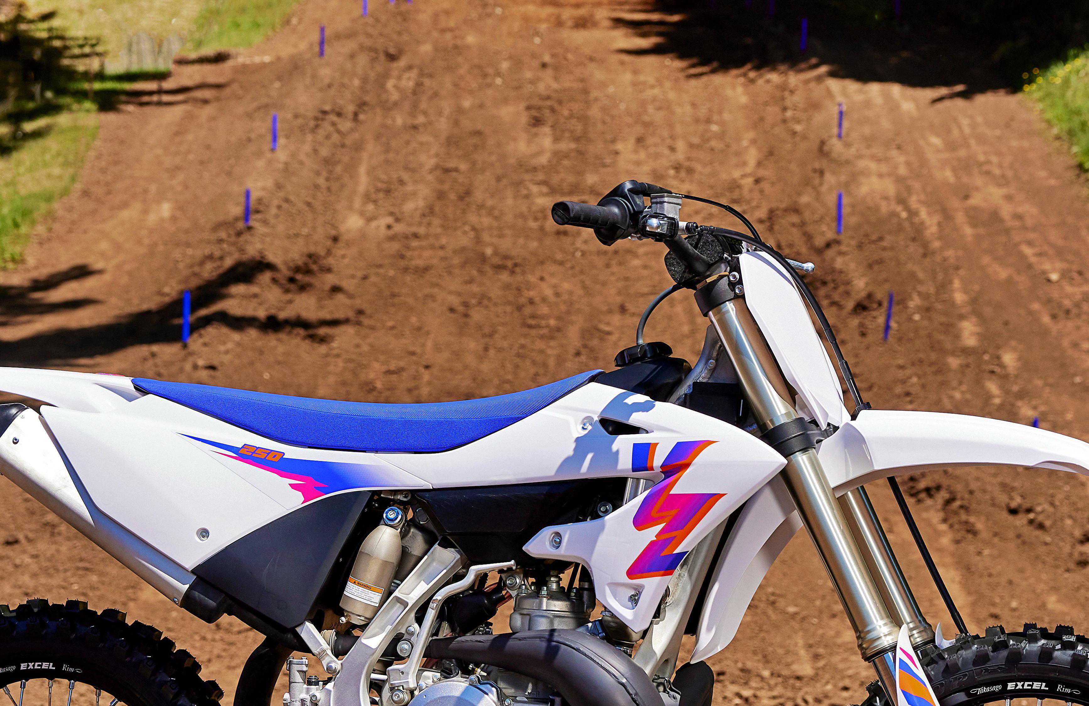 2024YZ125LC五十周年纪念版以标准版为基础,车身图案修改为白色的主色调、粉色的线条,这是YZ在上世纪七十年代里的传统色彩风格。此外,紫色的鞍座(标准版使用蓝色的鞍座)、黑色的前后车轮(标准版使用蓝色的前后车轮),也是这一版本的独特之处。